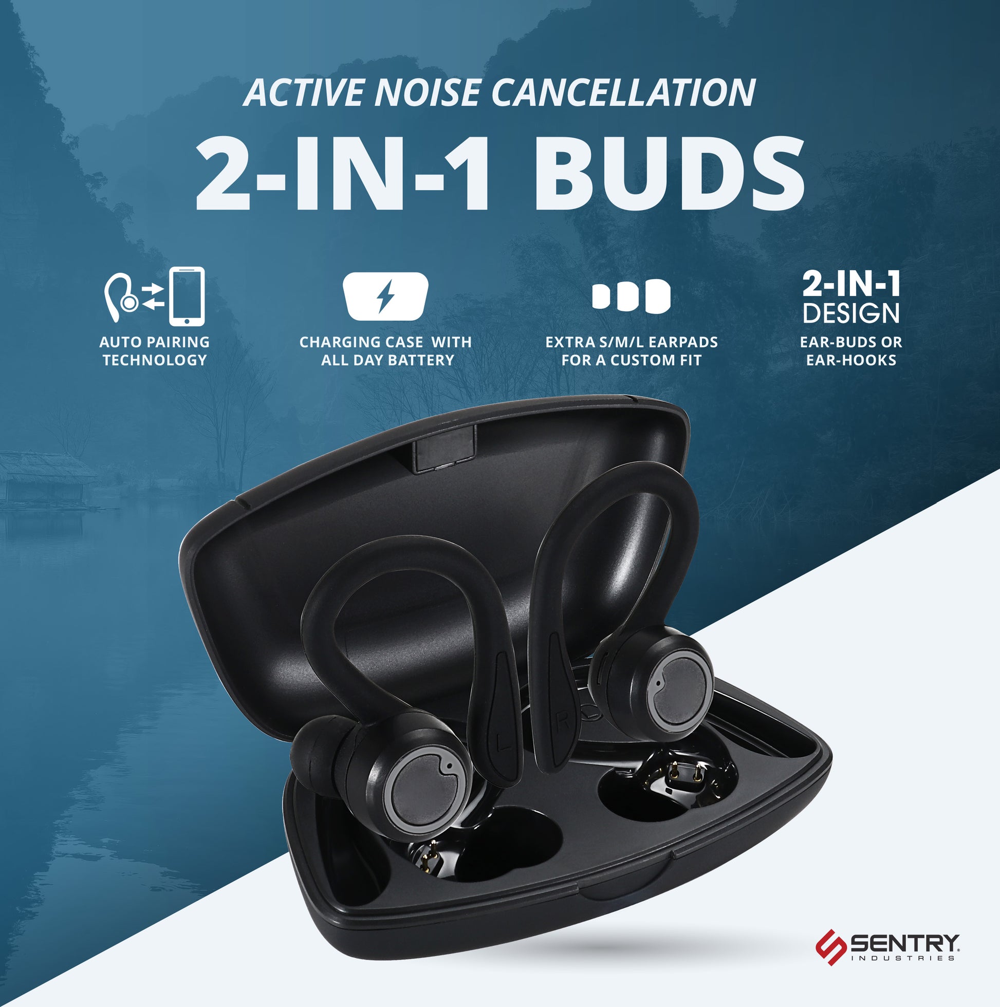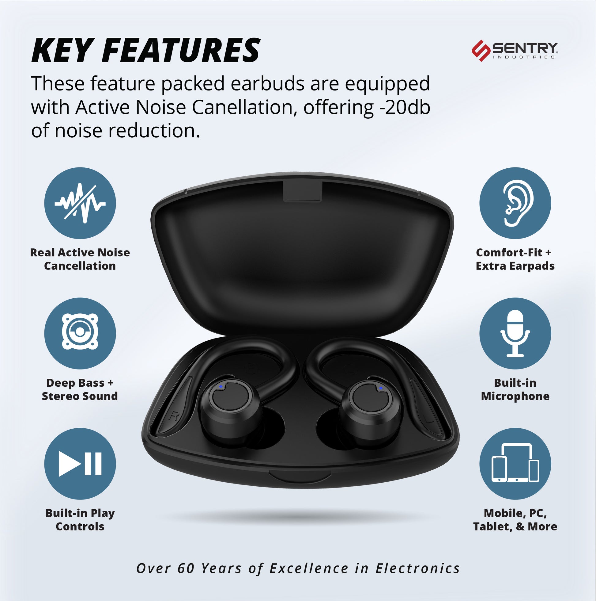 - Noise Cancellation: These Sentry Hook Earbuds are equipped with Advanced Noise Cancellation technology that blocks out ambient noise for an isolated listening experience. With Active Noise Cancellation these earbuds cancel up to -20dB of outside noise so you can listen to your headphones with no distracting outside noise. With Sentry’s Active Noise Cancellation pesky mid to high-frequency sounds are cancelled out so well their comparable to Active Noise Cancelling earbuds worth double the price!